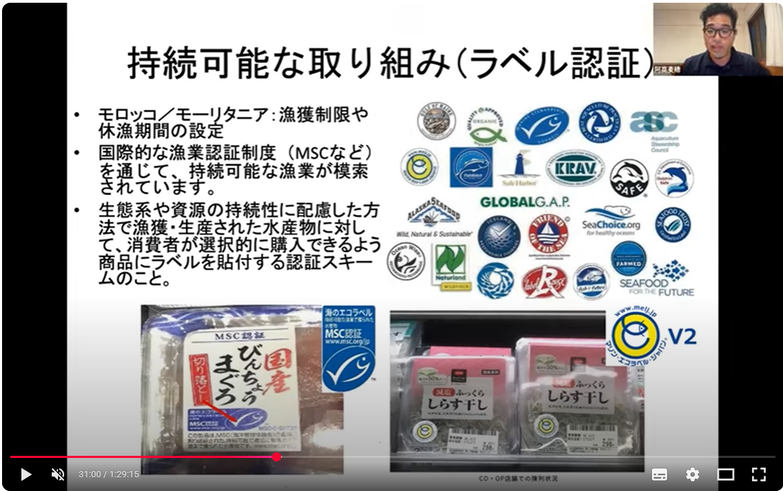 阿高:残念ながら、生鮮品のタコには認証ラベルはついていません。しかし、タコの加工品には様々な認証制度があり、日本で売っているものにも認証ラベルがついています。認証ラベルは、持続的な資源管理や人権に配慮した水産物に付けられるものです。MSCやマリン・エコラベル・ジャパンなどのラベルは普及しており、イオンや西友、生協などで扱われています。少し高くなりますが、そういうものを手に取っていただけたらいいのではと思います。ついていなくても日本のものは、安心安全のものが多いです。