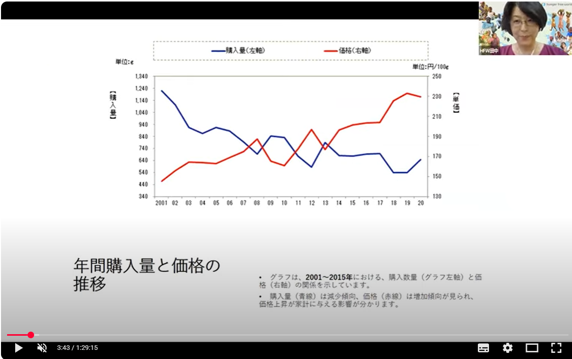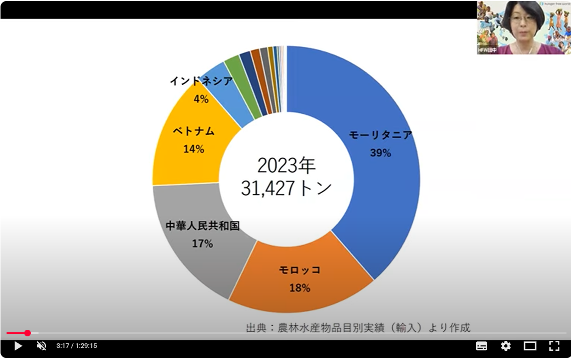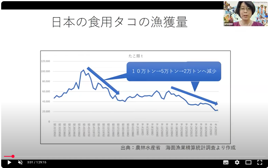 最初にFAO日本事務所長の日比さんからのメッセージの後、ハンガー・フリー・ワールド(HFW)の学生インターン・矢代さんから、食料問題の全体像についての導入がありました。その後、OAFICの阿高麦穂さん、西サハラ友の会の松野明久さん、兵庫県漁業協同組合連合会の西本広幸さんから、タコを中心に世界と日本の水産資源の現状をお話しいただきました。